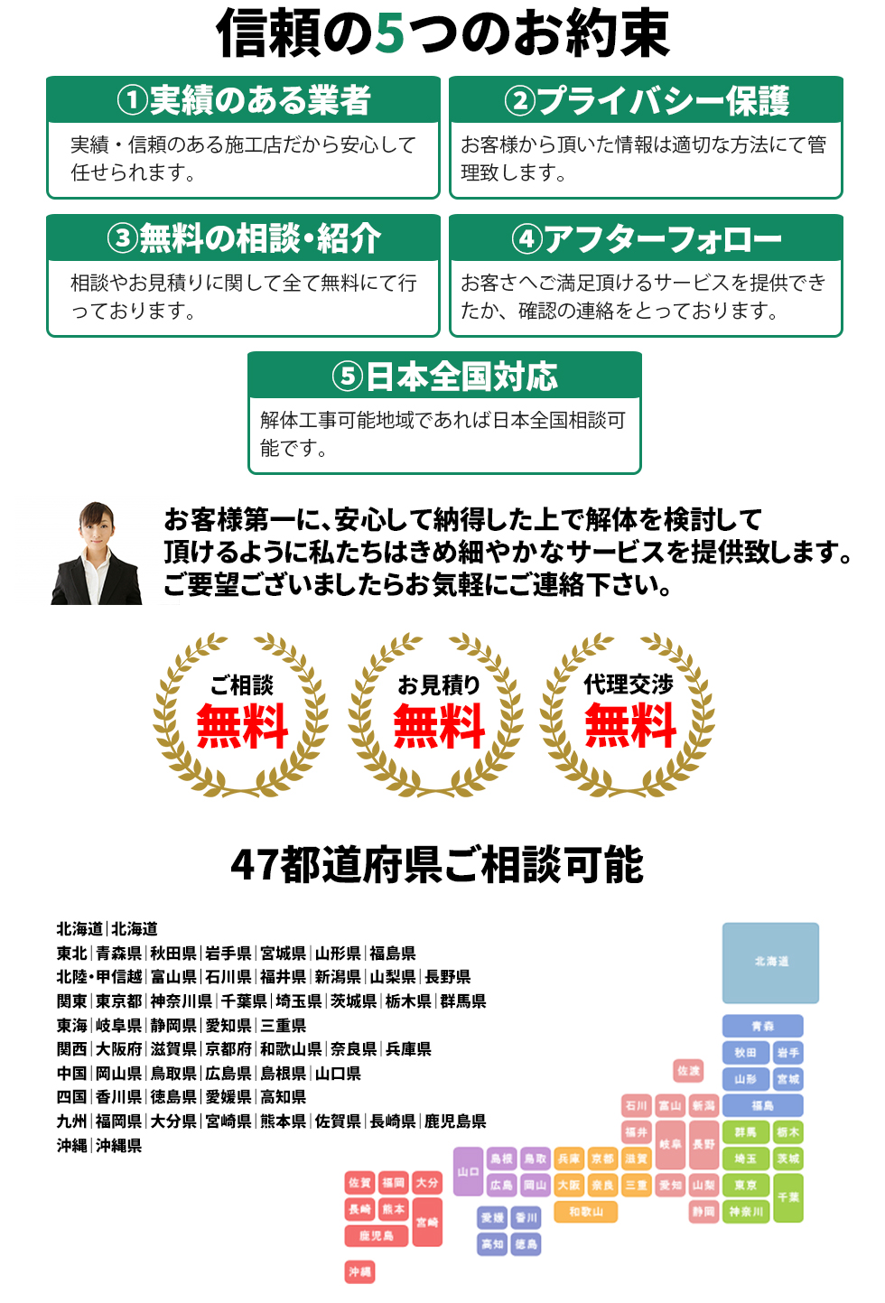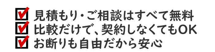 ご相談から、紹介、お見積りも無料で対応しております。ご契約前であれば、キャンセルなども無料で行っております。担当業者との代理での交渉も無料です。