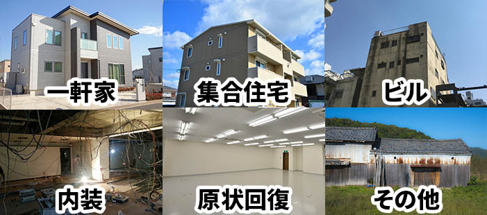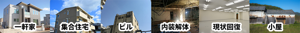 家の解体(平屋、2階建て)や鉄骨の工場、RC造のビルまで幅広く解体を行います。