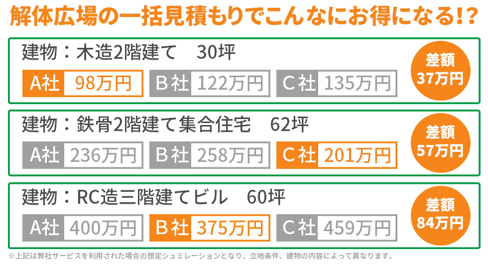 ※車・重機が入れない場合などのオプションは含んでおりません。あくまでも一般的な解体の場合の概算金額です。